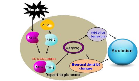 Based on the mouse animal models, they clarified the role of autophagy in addiction, and then explored the molecular mechanism of autophagy induced by morphine. They found that repeated morphine administration led to upregulation of ATG5 and ATG7, which facilitated the formation of the ATG12-ATG5 conjugate and Atg5- and Atg7-dependent autophagy in the dopaminergic neurons.