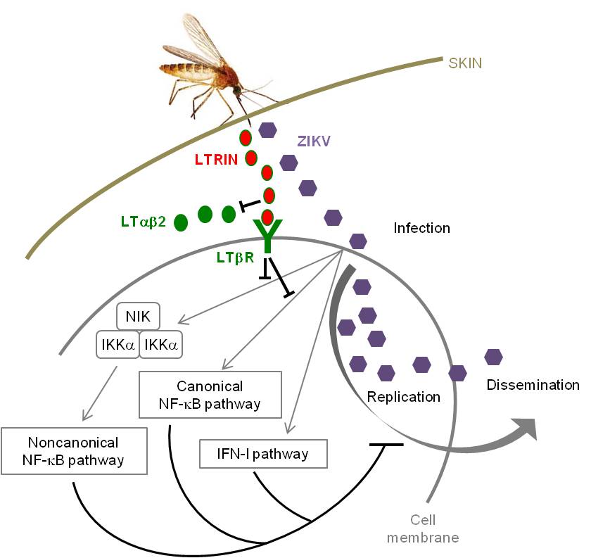 Mechanically, LTRIN bound to LTbR and preferentially inhibited NF-kB signaling and inflammatory cytokines production through interfering with LTbR dimerization during ZIKV infection. Furthermore, anti-LTRIN treatment inhibited mosquito-mediated ZIKV infection, and LTbR abrogation was demonstrated to potentiate ZIKV infectivity both in vitro and in vivo.
