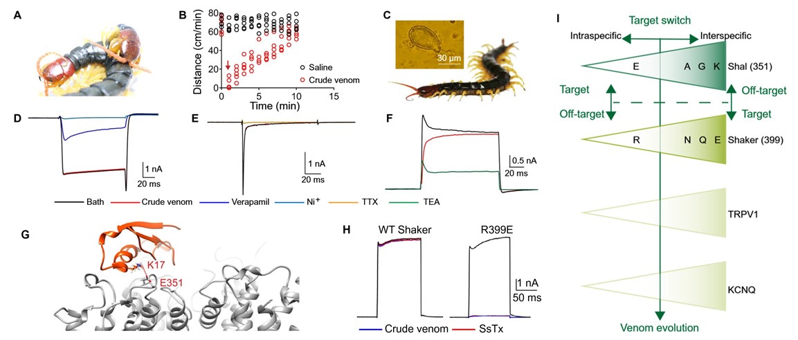 FIGURE 1. The target-switching mechanism in centipede. (A) Photograph of the S. subspinipes self-envenomation. These centipedes inject venom to each other during intraspecific interaction. (B) Movement distance recorded per minute following injection of 10 μl of crude venom or saline. (C) Images of the S. subspinipes and the isolated DUM neuron. (D-F) Whole-cell DUM calcium (D), sodium (E), and potassium (F) currents challenged by crude venom (1 mg/ml), 20 μM verapamil, 25 μM Ni+, 1 μM TTX, and 100 mM TEA, respectively. (G) The salt bridge formed between SsTx K17 and Shal E351 was indicated in SsTx-Shal structural model. (H) Representative whole-cell recordings of centipede Shaker (left) and single-point channel mutant (right) in the presence of crude venom (1 mg/ml) or 1 μM SsTx. (I) Schematic diagram summarizing the target-switching mechanism in centipede survival strategy of both intraspecific and interspecific interaction. Target specifications (Shal, Shaker, TRPV1, and KCNQ channels) underlying the envenomation of conspecifics and heterospecifics are shown. Representative point mutations of species-specific Shal and Shaker channels are differentiated in conspecifics and heterospecifics.