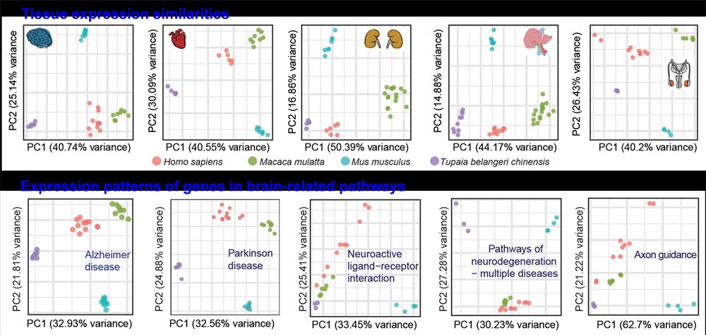Based on this comprehensive annotation, they explored the spatial expression and alternative splicing patterns of the tree shrew transcripts and characterized the orthologous relationships among tree shrews and other species. They also compared expression similarity across species and found that the species clustering patterns based on expression data from brain, liver, testis, kidney, and heart tissues showed distant divergence of mice from primates and tree shrews. Meanwhile, they identified 13 pathways showed greater protein sequence identity between tree shrews and humans than between mice and humans. The 13 pathways including neuro-related pathways such as “Parkinson’s disease” and “Alzheimer’s disease”. They also profiled the expression patterns of five pathways related to the brain and found that mice had a more distant clustering pattern than tree shrews with primates. Which shows that tree shrews are closer to primates than to mice at the transcriptomic level.