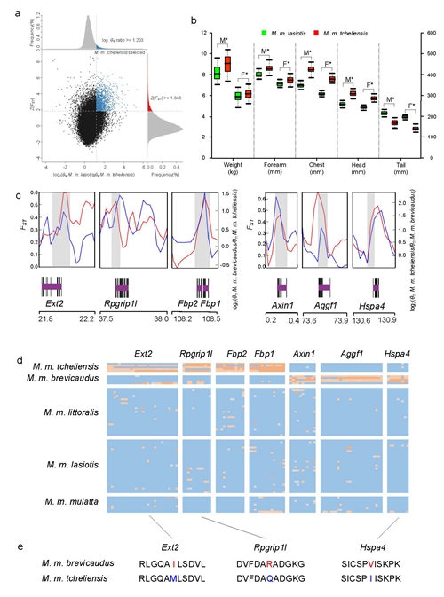 At present, Prof. Li Ming’s team at Institute of Zoology, Chinese Academy of Sciences (IOZ, CAS) and Prof. Michael W. Bruford’ team at Cardiff University, UK, re-sequenced 81 geo-referenced individuals of five subspecies from 17 locations in China using Illumina HiSeq2000 and Illumina HiSeq2500 and conducted the study of its population genomics. The results indicated that the wild RMs populations were structured into five genetic lineages on the mainland and Hainan Island, recapitulating current subspecies designations. These subspecies are estimated to have diverged 109 to 18 thousand years ago, but feature recent gene flow. Consistent with the expectation of a larger body size in colder climates and smaller body size in warmer climates (Bergman’s rule), the northernmost RM lineage (M. m. tcheliensis), possessing the largest body size of all Chinese RMs, and the southernmost lineage (M. m. brevicaudus), with the smallest body size of all Chinese RMs, feature positively selected genes responsible for skeletal development. Further, two candidate selected genes (Fbp1, Fbp2) found in M. m. tcheliensis are involved in gluconeogenesis, potentially maintaining stable blood glucose levels during starvation when food resources are scarce in winter. The tropical subspecies M. m. brevicaudus showed positively selected genes related to cardiovascular function and response to temperature stimuli, potentially involved in tropical adaptation. This study also found 118 SNPs matching human disease-causing variants with 82 being subspecies-specific.