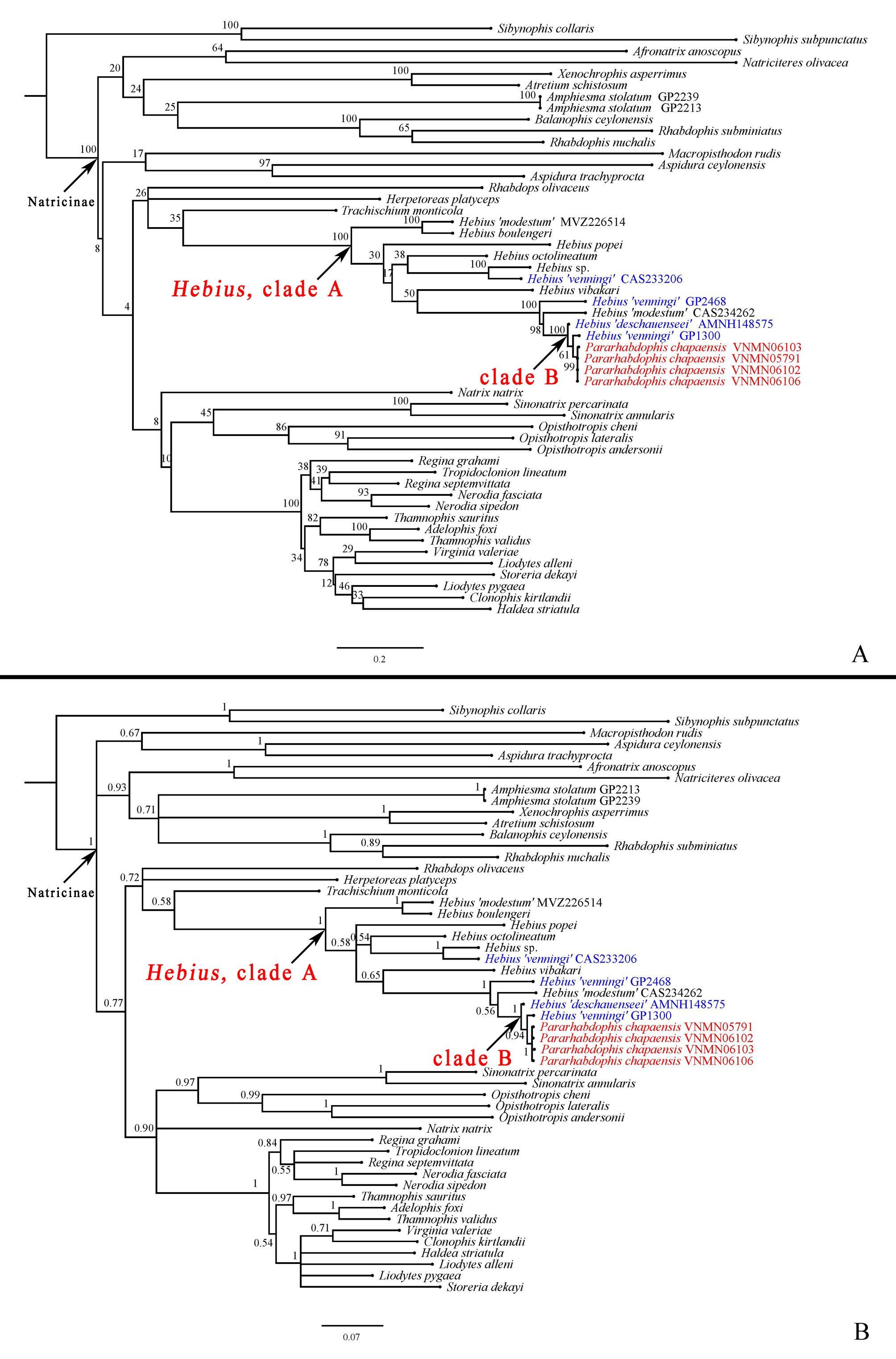 The common paraphyly of Hebius species reflects the need of continuous taxonomic analyses on the group in Asia. As very few taxonomic studies have been conducted for the Natricinae, the understanding of this subfamily in northern Indochina remains understudied. Thus this work also calls for further fieldwork and continuous taxonomic studies of the group in the under-surveyed regions.