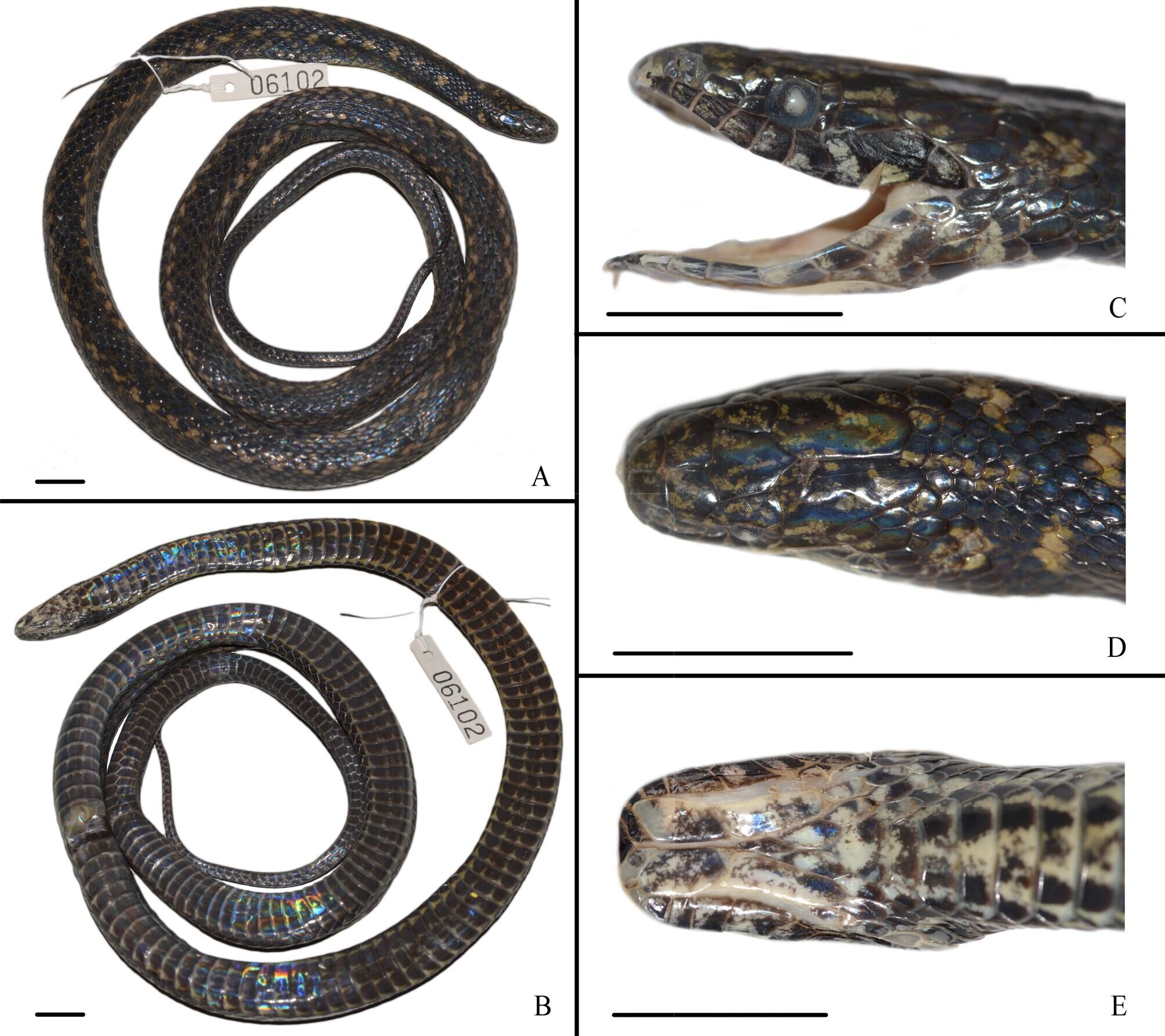 Figure3. Adult male specimen of Hebius chapaensis, in preservative, (A) Dorsal view; (B) Ventral view; (C) Lateral head view, left side; (D) Dorsal head view; (E) Ventral head view. Scale bar 10mm