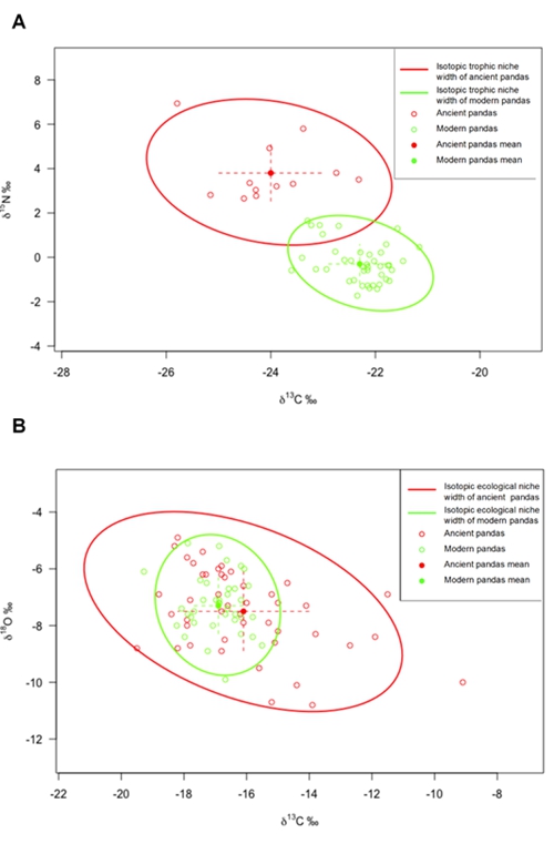 Carbon and nitrogen isotope ratios in bone collagen from ancient pandas, modern pandas and sympatric species indicate that the trophic niches of ancient and modern pandas are distinctly different. According to SIBER model analysis, the isotopic trophic and ecological niche widths of ancient pandas are approximately three times larger than those of modern pandas. This suggests that ancient pandas might have a more complicated diet and were not obligate bamboo feeders, and they probably adapted to a variety of habitat types, such as forest fringes, subtropical zones and open land, other than dwelling in bamboo forests as they do today.