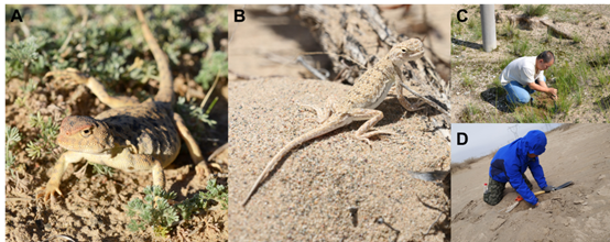 Fig. 2. Photos of P. vlangalii (A, Image by ZHOU Weiwei) and P. przewalskii (B, Image by QIN Yin); Field work photos of ZHOU Weiwei (C, Image by GAO Wei) and GAO Wei (D, Image by CHEN Yijing). The comparative analysis of stage-specific highly expressed genes (HEGs) in S1, when an eggshell gland is expressed in egg-laying species, suggests a clear mechanism for eggshell degeneration in viviparous species (Fig. 3). Most of S1-specific HEGs in P. przewalskii (oviparous), which involved in uterine cell differentiation, proliferation and morphogenesis, gland development, were not highly expressed at S1 in viviparous P. vlangalii. And genes in estrogen receptor (ESR) pathway which were reported related to shell gland formation highly expressed at S1 in P. przewalskii, but reverse in viviparous species. These specific expression pattern changes appear to be among the changes associated with the loss of eggshell formation in the viviparous species.