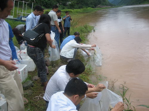 On July 17, 2012, at 2:30 PM, YANG Jun-Xing’s research group released over 17,000 fry into the Lixianjiang River at the reservoir area of Jupudu Hydropower Station. This release of 11,000 Neolissochilus benasi fry and 6,000 fry of Semilabeo obscurus marks the success of several years of work aimed at shoring up these species.