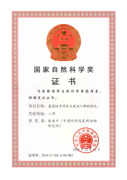 The 2014 National Science Awards were held in the Great Hall of the People on January 9, 2015. Professor Yaping Zhang and his team won the second prize in Natural Sciences for their project on genomic diversity and Asian peoples (contributors: Yaping Zhang, Qingpeng Kong, Dongdong Wu, Minsheng Peng, and Chang Sun). 2014 marks the third consecutive year in which Dr. Zhang and his team have taken home this prestigious national science and technology award.