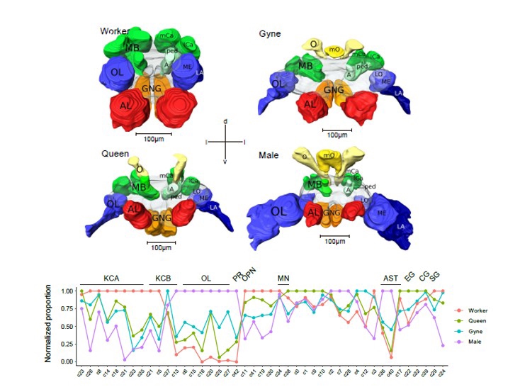 The brain anatomies and cell compositions of the four different castes were compared. Male and worker had extremely specialized brain forms. Worker had the most abundant mushroom body Kenyon cells (the brain center responsible for higher cognitive functions such as learning and memory) and olfactory projection neurons while the least abundant vision related optic lobe neurons. The cellular composition of male brain was of opposite trends. Male had the least abundant Kenyon cells and olfactory projection neurons while the most abundant optic neurons. Gyne/queen had the intermediate brain forms with moderate abundances for most cell types (Figure 3). The observation suggests that the worker may have better olfaction processing abilities, capable of cognitive demanding tasks and exhibit flexible behavioral strategies. In contrast, the specialized male brain may well equip him to display the stereotyped and extremely targeted mating behavior. The intermediate brain forms in gyne/queen may endow them with full behavioral repertoire which are barely good enough when they initially found new colonies and are reminiscent of the solitary living ancestor who must play totipotent roles without worker assistance.