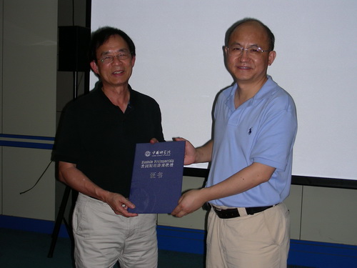 Dr. Wen-Hsiung Li accepting the certificate of “Einstein Professorship Program, CAS” from Dr. Yaping Zhang (right).
