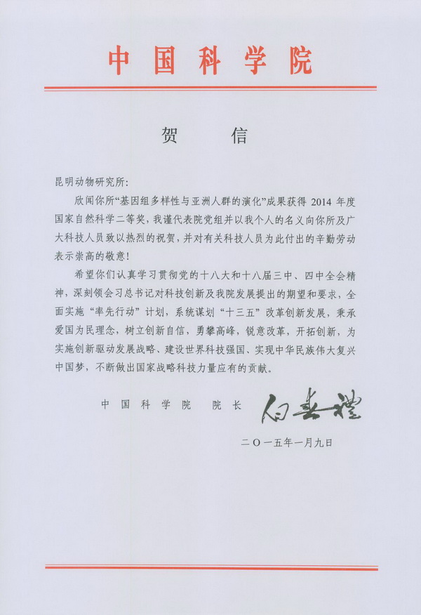Dr. Yaping Zhang and Dr. Qingpeng Kong won a second place prize for natural sciences during the National Science awards for their work on genomic diversity and Asiatic peoples. The news was announced on January 9, 2015, at the National Science and Technology Awards Conference, after which Bai Chunli issued the following congratulatory letter.