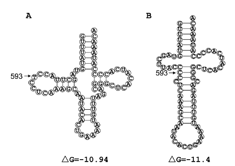 Predicted secondary structure of the wild type human MT-TFgene (A) and the mutant harboring m.593T>C (B). Position 593 was marked by an arrow. DG means the free energy. (Figure by KIZ)