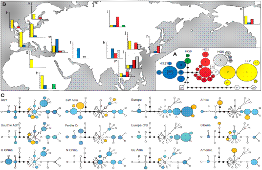 Figure 1 Phylogenetic and geographical distribution of haplotypes. (A) Most parsimonious phylogenetic tree. Haplotypes (symbolized by circles for dog, squares for wolf and hexagons for coyote; black dots are hypothetical intermediates) are separated by one substitutional step. The area of the circles is proportional to the frequency of the haplotype among dogs. Haplogroups (see text) are indicated by colour; haplotype 2* cannot be assigned to HG1 or HG3 and therefore white. (B) Geographical distribution of haplogroups. Graphs show number of individuals carrying each haplogroup, colours referring to haplogroups according to (a). Populations: a, Scandinavia; b, Britain; c, Central Europe; d, South Europe; e, Fertile Cr; f, SW Asia East; g, Northern Africa; h, Southern Africa; i, Siberia; j, North China; k, Central China; l, South China; m, Southeast Asia (l and m jointly forming ASY); n, Japan; o, America. For definitions of geographical regions, see Note to Table 1, and Materials and methods. (C) Trees (see a) showing representation (blue, shared with other regions; yellow, unique to the region; white, not present) and frequency (proportional to area) of haplotypes among dogs in geographical regions. Europe C/S, Central and South Europe; SE Asia, Southeast Asia (figure and legend by KIZ).