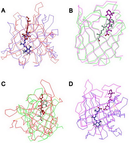 In both of the extracellularretinoid-binding proteins (RBP and ERABP), the β-ionone ring of the ligand is positioned in the center of the barrel with the isoprene tail extending along the barrel axis pointing toward the solvent. However, the orientation of the ligand isopposite to that of the corresponding intracellular proteins (CRBPs and CRABPs).In addition, none of the amino acid residues involved in ligand binding is conserved between the transport proteins. However, for each specific binding protein, the amino acids involved in the ligand binding are conserved.