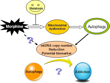 In establishing the rodent model of morphine addiction, Feng’s team found that pretreatment with low-doses of melatonin could block the morphine-induced behavioral sensitization and pain tolerance, and that the effect of melatonin on morphine induced hippocampal tissues was accompanied by reduced autophagy. At the same time, the mitochondrial DNA copy number returned to close to that in the control group. Feng’s group also noticed that during a 6 month follow-up of heroin addicts who had undergone detoxification, the melatonin levels in plasma increased relative to that at the beginning of detoxification, as did the mitochondrial DNA copy number; however, neither was restored to the observed level in a normal population.
