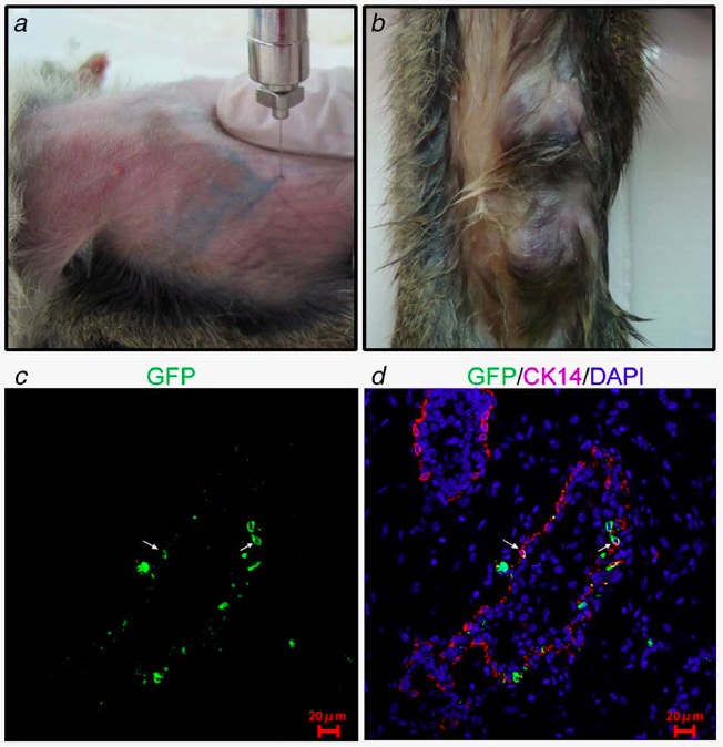 Induction of tree shrew mammary tumors using lentivirus expressing PyMT by intraductal injection. a. Lentivirus were injected into tree shrew mammary ducts and traced by trypan blue. b. Tree shrews developed mammary tumors after injecting lentivirus expressing PyMT. c, d. Immunofluorescence analysis of PyMT virus infected mammary cells. GFP as stained in green and CK14 was stained in red. Nuclear DNA was stained with DAPI (in blue). c shows GFP only and d shows a merged picture for both GFP and CK14. The white arrows indicates GFP/CK14 double positive cells.