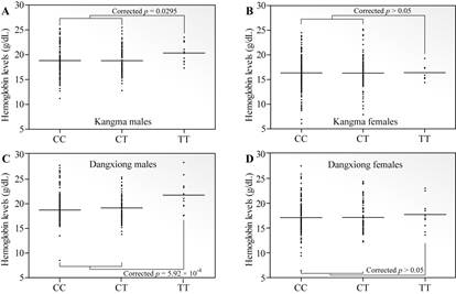Legend: Comparison of hemoglobin levels among three genotypes (CC, CT, and TT) at rs4786504 in Tibetan males and females from two geographic Tibetan populations.