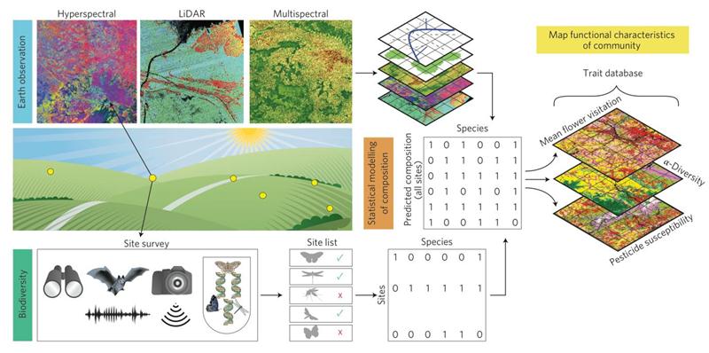 In our new paper, Connecting Earth Observation to High-Throughput Biodiversity Data, we describe a new approach that leverages automated recording devices (ARDs), high-throughput DNA sequencing, and ecological statistics to extract the full information content of EO data. EO technology is providing ever more sophisticated sensors, wider data availability, higher spatial and temporal resolution, and near-continuous global coverage of a large range of biophysical parameters. In combination, ARDs and sequencing allow efficient measurement of biodiversity at high taxonomic resolution, and ecological statistics let us interpolate point samples of biodiversity to create continuous maps of species composition at landscape-scale. We conclude with an overview of approaches for implementing and institutionalising the interdisciplinary collaborations that will be needed to combine these separate fields.