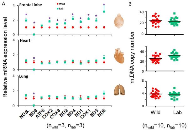 Relative mRNA expression levels of mitochondrial coding genes (A) and mtDNA copy number (B) in wild brown and laboratory rats. (Image by ZHANG Yaping’s Group)