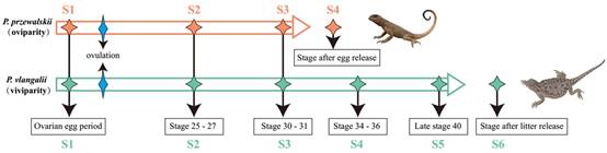 A team of scientists from the Kunming Institute of Zoology of the Chinese Academy of Sciences (KIZ, CAS), together with another five teams from different institutes and universities, sequenced the genomes of viviparous Phrynocephalus vlangalii and oviparous P. przewalskii, and compared the transcriptomes of maternal oviducts through the development of eggs and embryos of both species (Fig. 1 & 2). In addition, they further compared the transcriptomes of three other pairs of closely related oviparous and viviparous species of the genera Eremias, Scincella, and Sphenomorphus to examine potential sequence convergence associated with viviparity across independent origins of this transition.