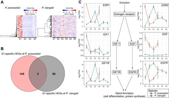 Fig. 3. Expression pattern of genes related to shell gland degeneration. (A) Expression heatmaps of genes specifically highly expressed at S1 in P. przewalskii (left) and orthologous genes in P. vlangalii (right). (B) Comparison of genes specific highly expressed before ovulation (at S1) of two species. (C) Expression pattern of key genes that are related the expression of shell glands. Red lines and circles represent gene-expression in P. przewalskii, green lines and circles represent gene-expression in P. vlangalii. Error bars present ±1 SE. (Image by GAO Wei)