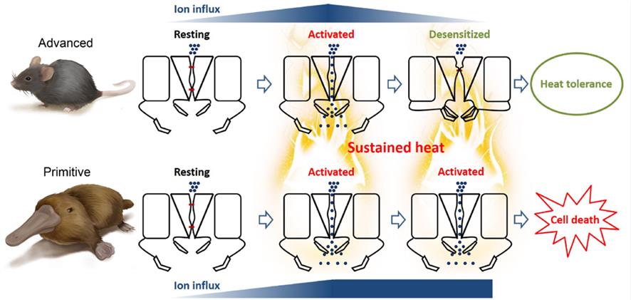 This study reveals the molecular basis for Dh of TRPV1 channels and its biological significance in mammalian evolution. Moreover, the work shows that TRPV1 Dh is a very important high-temperature protection mechanism for higher mammals. As one of the most primitive mammals, the platypus has yet to evolve a high temperature-mediated "activation-desensitization" equilibrium mechanism. Therefore, the platypus is extremely sensitive to a temperature higher than 25 °C and it is difficult for it to adapt to extreme terrestrial living conditions.