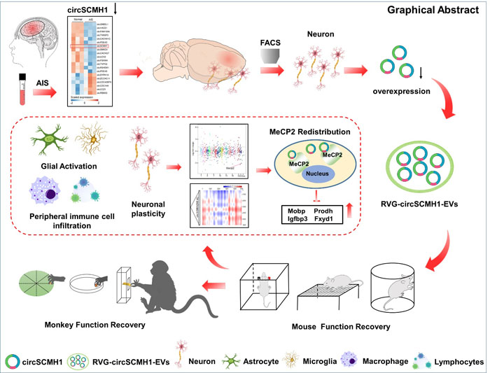Stroke is the third most common cause of mortality and often leads to long-term disability with no efficient clinical therapy in place. In 80% of cases, stroke is diagnosed as ischemia induced by thrombotic occlusion of cerebral arteries or branches. A variety of circular RNA (circRNAs) molecules are known to function in ischemic brain injury. In a recent study published in Circulation, researchers from Medical School of Southeast University and Kunming Institute of Zoology (KIZ), Chinese Academy of Sciences (CAS) presented a potentially widely applicable nucleotide drug delivery technology. They demonstrated that the basic mechanism of how circRNAs can be therapeutically exploited to improve post-stroke outcomes. The researchers screened circular RNA SCMH1 (circSCMH1) from the plasma of acute ischemic stroke (AIS) patients using circRNA microarrays and engineered RVG-circSCMH1-extracellular vesicles (RVG-circSCMH1-EVs) which selectively deliver circSCMH1 to the brain. They found that circSCMH1 treatment improved functional recovery post stroke in both mice and monkeys, and discovered that circSCMH1 enhanced the neuronal plasticity and also inhibited glial activation and peripheral immune cell infiltration. Mechanistically, circSCMH1 binds to the transcription factor MeCP2, thereby releasing repression of MeCP2 target gene transcription. The study, titled Extracellular Vesicle-Mediated Delivery of CircSCMH1 Promotes Functional Recovery in Rodent and Nonhuman Primate Ischemic Stroke Models, was published on Circulation on May 22, 2020. Website link: https://www.ahajournals.org/doi/10.1161/CIRCULATIONAHA.120.045765. The monkey study was supported by the National Key Research and Development Program of China (2018YFC1313803), Yunnan Key Program of Science and Technology (2017FA042) and the National Science Foundation of China (31771194, 31571109).