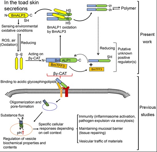 Recently, the Kunming Institute of Zoology and the University of Science and Technology of China have further revealed that the oxygen-dependent homologous protein regulation mechanism of the secretory cell endocytosis channel. The paralog of CAT, named BmALP3, was first identified. Though lack membrane pore-forming capacity, BmALP3 can sense environmental oxygen tension and transformed between monomer and homodimer, and then negatively regulates the assembly and biological activity of CAT via disulfide-bond exchange. BmALP3 is inactivated under hypoxic conditions, which resulting in the release of the inhibitory state of the effector protein machine CAT and promotes cell emergency and inflammatory response. Interestingly, the structural basis of oxygen-dependent regulation mode is well conserved in numerous animals and plants. The paper titled "A cellular endolysosome-modulating pore-forming protein from a toad is negatively regulated by its paralog under oxidizing conditions" has been published online in the Journal of Biological Chemistry (https://www.jbc.org/content/early/2020/06/04/jbc.RA120.013556).