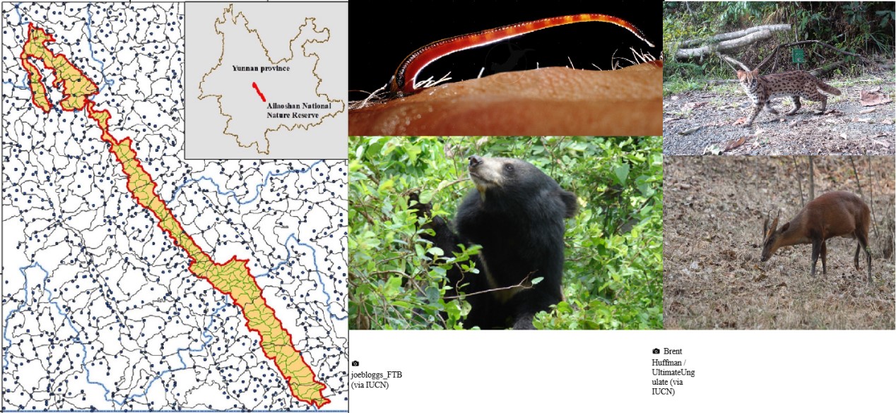 Figure 1. Ailaoshan National Nature Reserve map, a blood-sucking leech and some of the protected animals detected in this study.