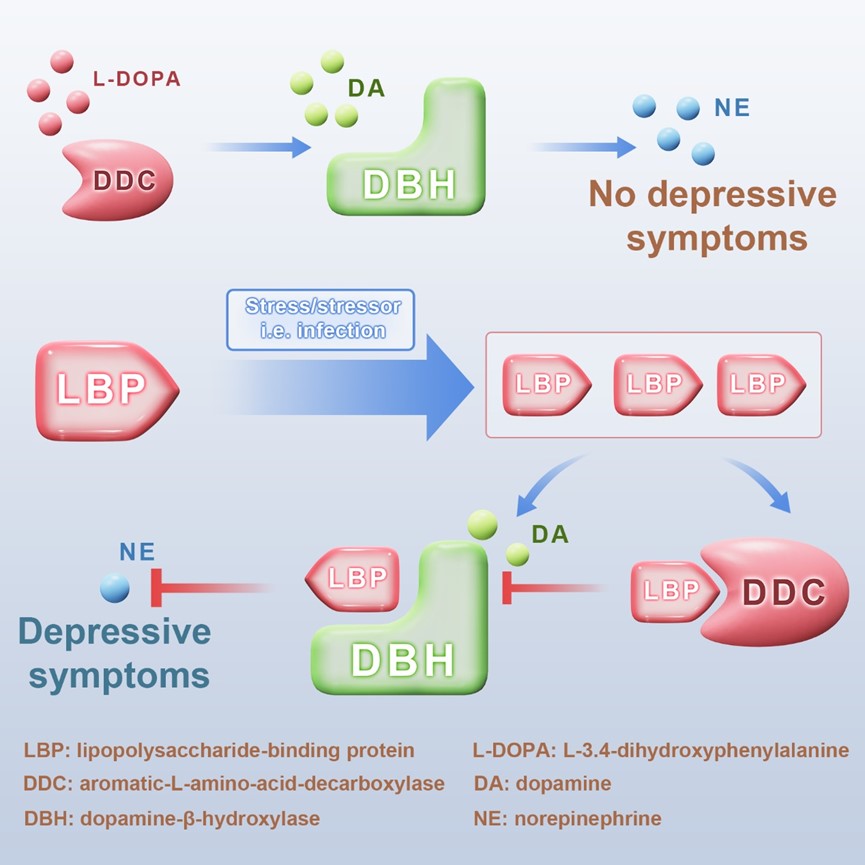 Recently, LAI Ren and his colleagues at Kunming Institute of Zoology, CAS in China published a research article entitled “Lipopolysaccharide-binding protein expression is increased by stress and inhibits monoamine synthesis to promote depressive symptoms” in Immunity (Article Link: https://doi.org/10.1016/j.immuni.2023.02.002). They revealed that chronic stress (e.g., social failure, chronic inflammation, etc.) significantly upregulated the expression of lipopolysaccharide/endotoxin binding protein (LBP). LBP was significantly upregulated in depressed individuals. This research also identified LBP as an endogenous inhibitor of aromatic-L-amino-acid-decarboxylase (DDC) and dopamine-β-hydroxylase (DBH), key enzymes of monoamine synthesis, inhibiting monoamine synthesis, which may have an important role in the development of depression. In mouse models of depression, promising antidepressant therapeutic effects were shown by intervening in LBP-DDC/DBH interactions. These results reveal that the inhibition of monoamine synthesis by LBP is the underlying cause of low monoamine levels in some depressed individuals, and that LBP is an important molecule in mediating immune to-brain bidirectional communication, providing new targets and directions for future treatment and diagnosis of depression.