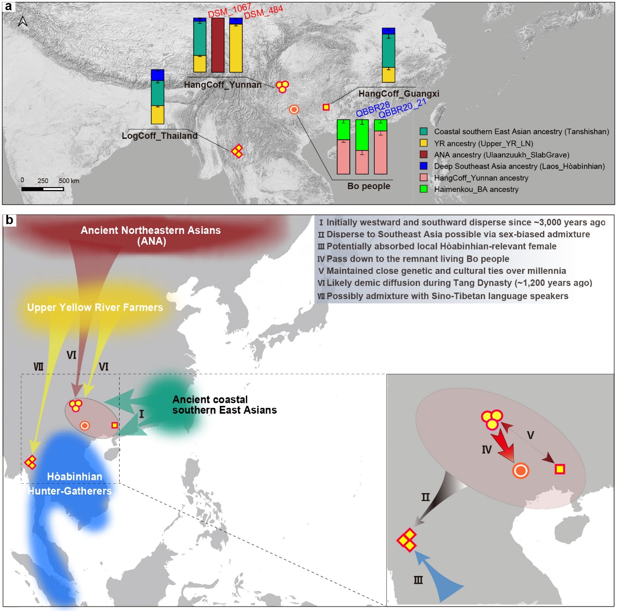 Figure 4. Ancestry composition and inferred dispersal scenarios of Hanging Coffin populations and Bo individuals.