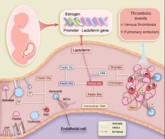 This study establishes lactoferrin as a key regulator of the pregnancy-associated hypercoagulable state, upregulated under estrogen control, and elucidates the lactoferrin-FXIa axis as a potential therapeutic target for anticoagulation, providing a novel and safer strategy for the prevention and management of VTE during pregnancy.